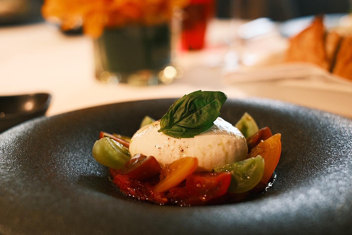 开场的布拉塔起司搭配番茄小编就超级喜欢!手工布拉塔起司以弹性外层包裹丝滑奶霜,搭配新鲜番茄的清甜与风乾番茄的浓缩鲜味,形成层次丰富的感官对比。乳化完整的萝勒青酱香气乾净,不掩盖起司原有的乳香。主厨将奶味、酸度与果香微调至平衡点,呈现出轻盈且精确的义大利经典风味。