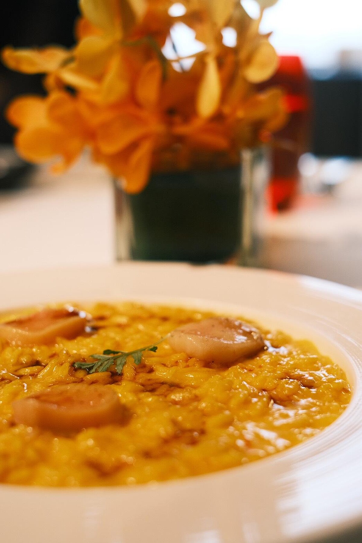 作为菜单中最具份量的经典菜色,番红花炖饭配牛骨髓展现了极致的米兰风情,米粒在吸饱高汤精华的同时,精準保留了韧度适中的米心,丝毫不显软烂。起锅前主厨透过高速搅拌将奶油与帕玛森起司完美乳化,赋予炖饭如丝缎般的滑顺质地。置于顶端的牛骨髓随温度缓缓渗透,丰腴油脂自然融入米粒孔隙,搭配长时间熬製的小牛肉浓汁,让整道菜在唇齿间交织出层次分明的脂香与鲜甜。