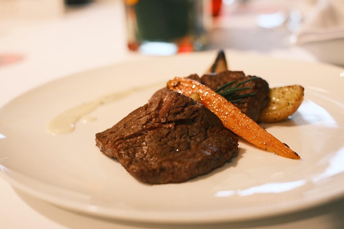 炭烤菲力牛排追求的是纯粹的力量,高温炭火封存肉汁,火候拿捏得恰到好处。虽然原味已足够鲜甜,但蓝纹起司酱的加入更是神来之笔,浓郁鹹味让味觉广度瞬间翻倍。搭配细緻的洋芋与红萝蔔衬托,让这道经典主餐显得丰富且和谐,这一道也是小编的最爱!