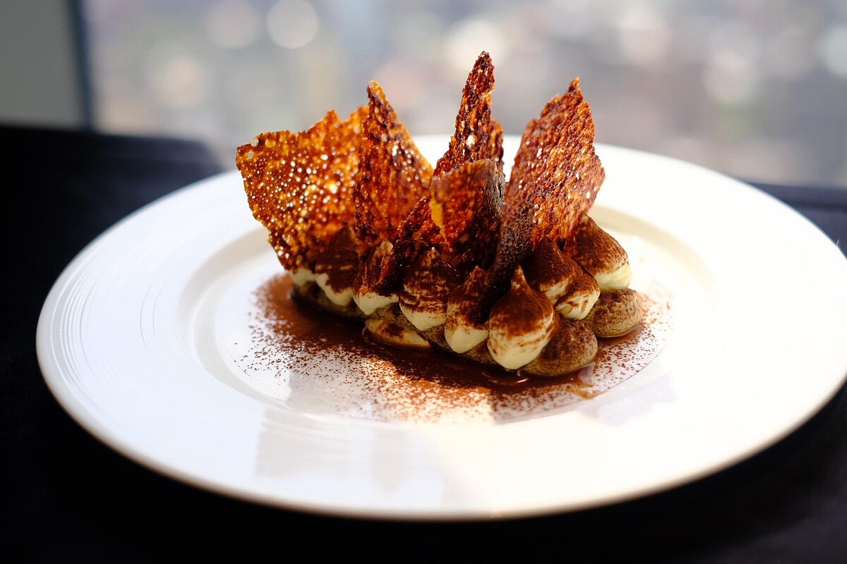 本季甜点以乾净平衡为核心,柠檬柑橘圆顶蛋糕强调果酸的鲜明与轻盈口感,有效平衡味蕾负担;榛果巧克力蛋糕则强调浓郁度,透过与香草冰淇淋的乳香对话,实现苦甜平衡。两种截然不同的风味象限,不仅提供了丰富的选择,更确保了整套客座菜单在结尾处依旧维持清亮、不沉重。