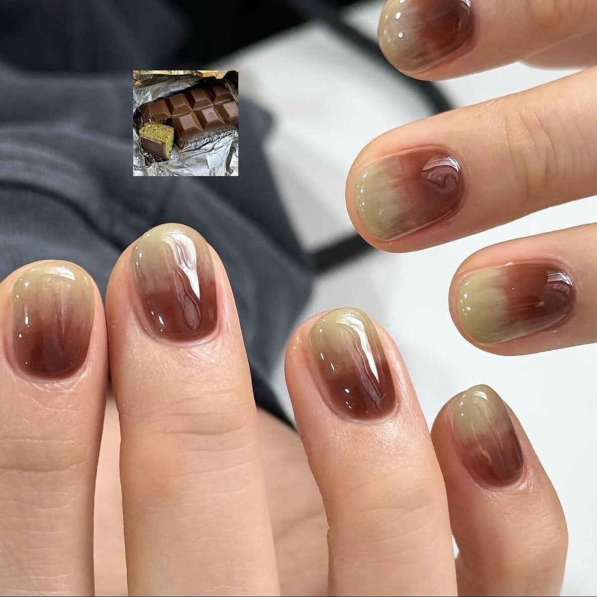 杜拜巧克力美甲款式4:开心果巧克力混色款