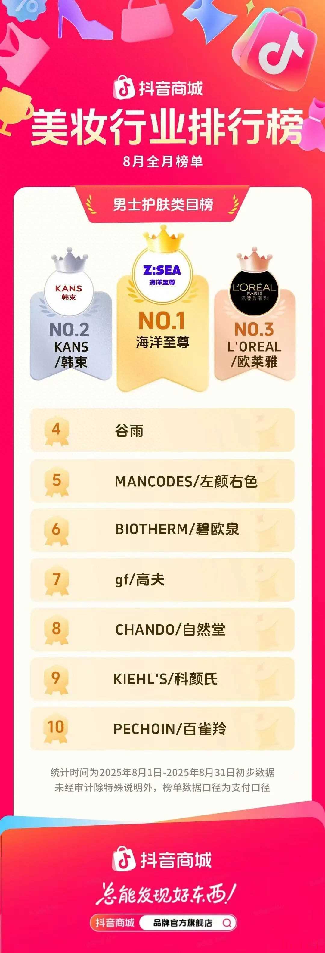 作者|豆芽当下的护肤行业,按照战略打法大致分为两个大门派。一类是所谓的正规军,即按照相对传统的品牌打法,一开始就在维护和建立品牌调性的品牌;另一类则是出身于新电商平台,以极致的投放效率、高频爆款内容,快速打出销量的玩家,后者常被称之为白牌。但也有不少介于两者之间,既有新生代的电商经营效率,也有独特品牌打法的玩家,这两年新崛起的男士护肤品牌海洋至尊就是一个代表性的品牌。8月,海洋至尊登上抖音商城“男士护肤类目榜”TOP1,超越了韩束、欧莱雅。