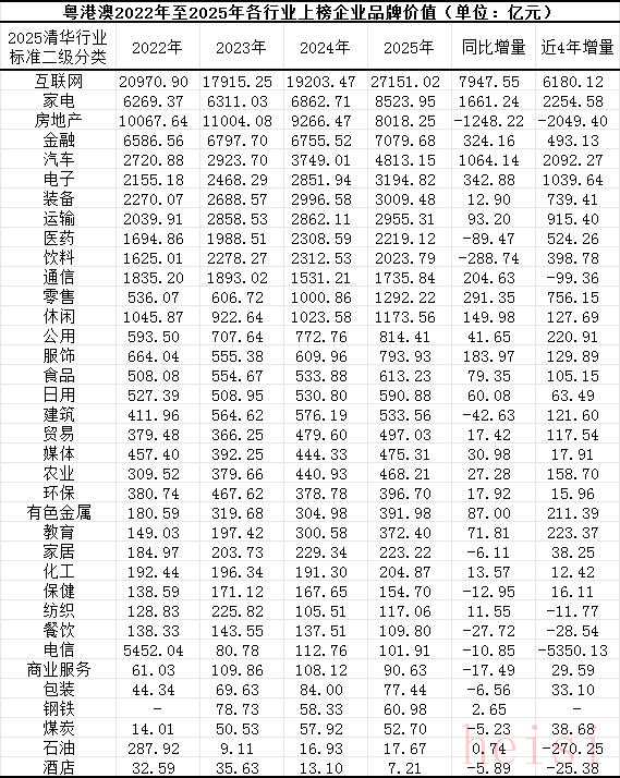 数据显示,互联网行业品牌价值位居第一,高达27151.02亿元,且远超其他行业;家电行业位居第二,品牌价值在2025年实现大幅增长,同比增加1661.24亿元;房地产行业位居第三,但品牌价值呈下滑态势,近4年降幅超2000亿元。此外,凭借比亚迪等新能源巨头,粤港澳的汽车行业近4年品牌价值增量超2000亿元。