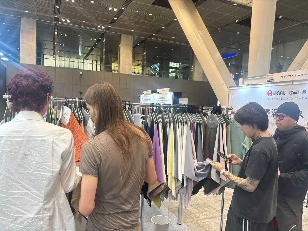 “柯桥优选”此次展出的精品面料,正是针对日本市场需求的“定制化呈现”——科技面料主打凉感、防紫外线、抗菌防臭、吸湿速干等功能,完美契合日本运动户外服饰市场对功能性的多元要求;绿色面料采用再生涤纶、雅赛尔®、莫代尔、莱赛尔等环保材料,其中适配内衣、家居服的面料产品收获大量关注;融合中日审美的时尚面料,则在简约设计中暗藏细节巧思,吸引多位采购商拍照观看。此外,每款展示面料均附有信息二维码,扫码即可实时查看产品的详细参数与检测报告,为采购决策提供了可靠依据,赢得了品牌方的高度认可。