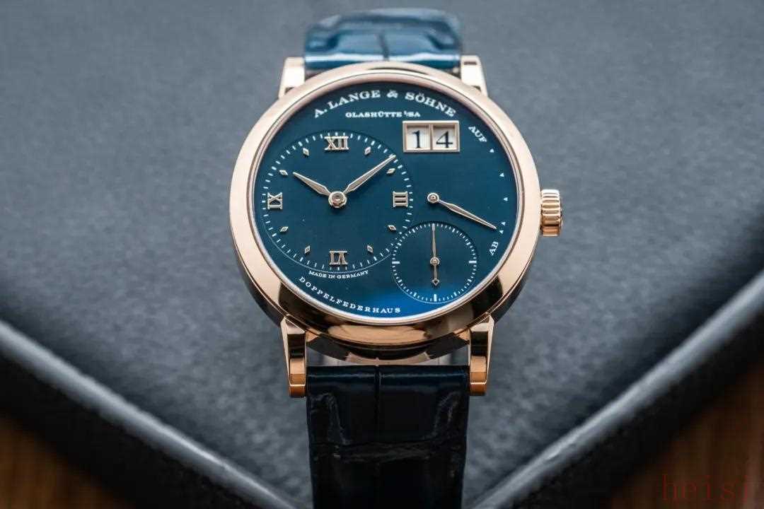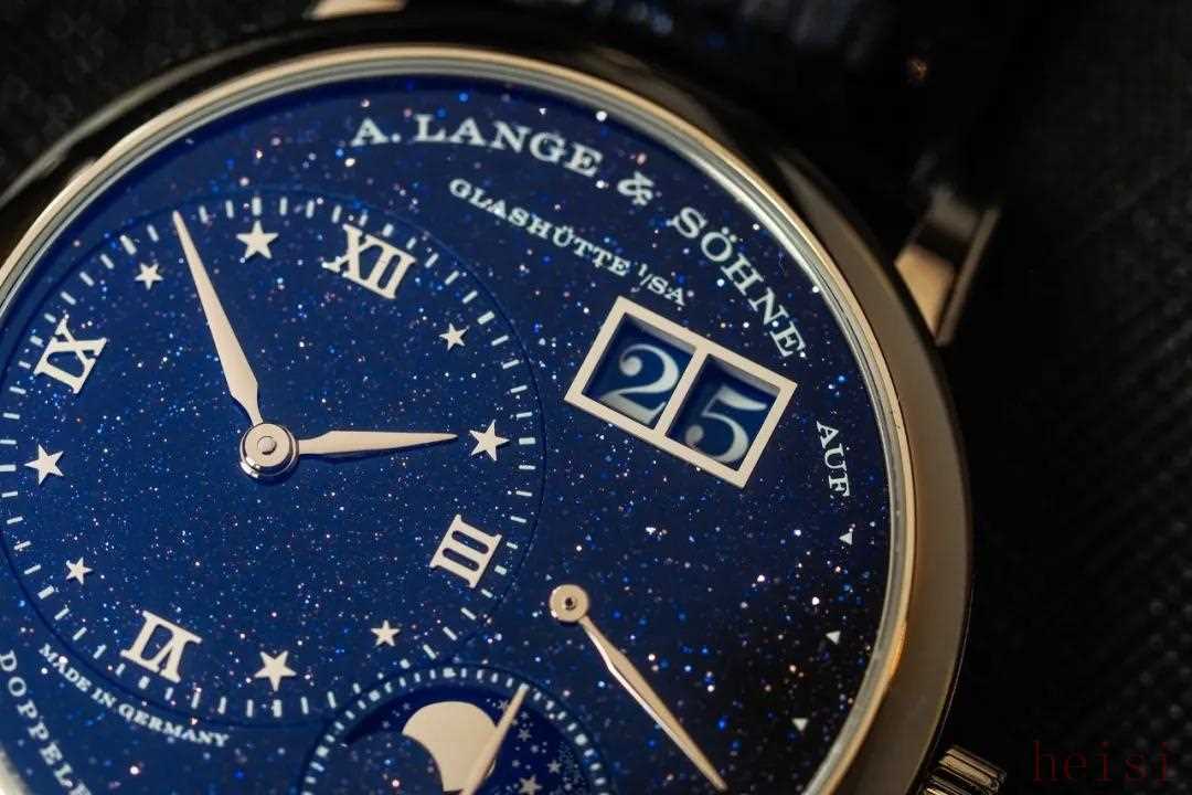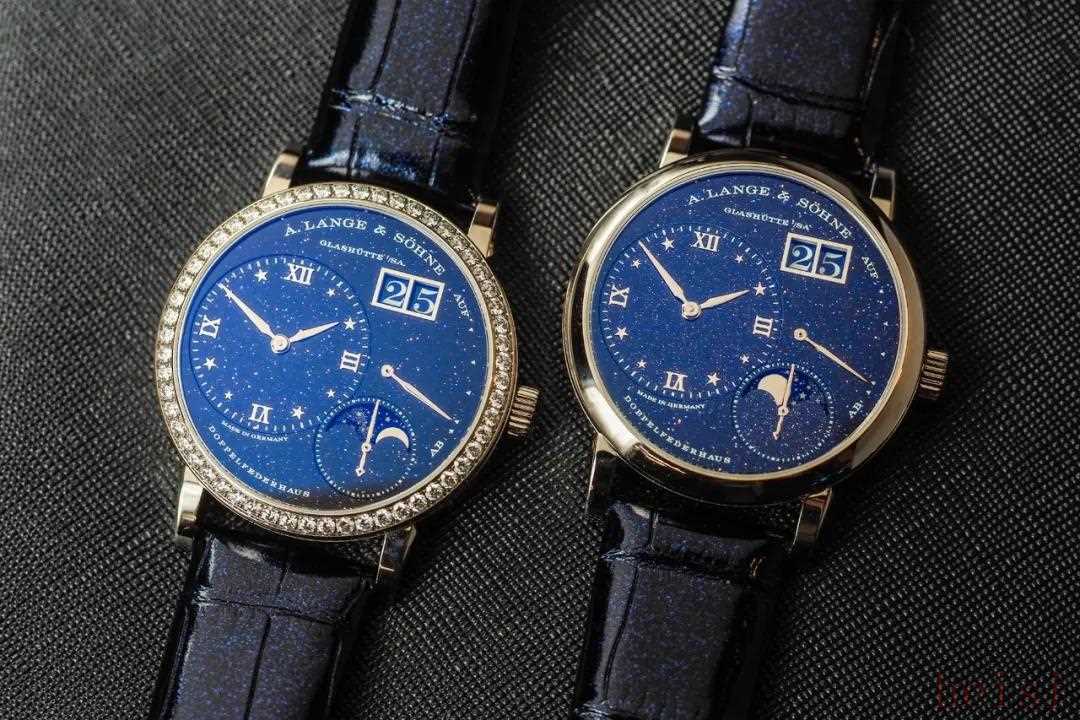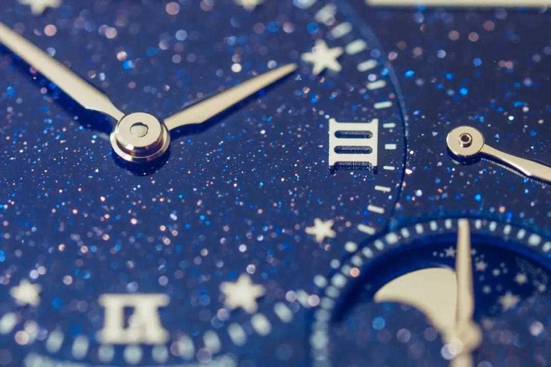 这支朗格1的星空盘,采用了砂金石盘面设计,在灯光下点点璀璨,完美还原了月亮、星星和夜空,连时标都用了星星符号,可谓从一切细节上都在全力的表达星空这个主题。朗格的蓝色我认为运用的更加出色,深邃并具备冲击力,质感非常棒,盯着表盘看,仿佛真的在看无边无际的夜空,会不由自主的让思维飞升天外。