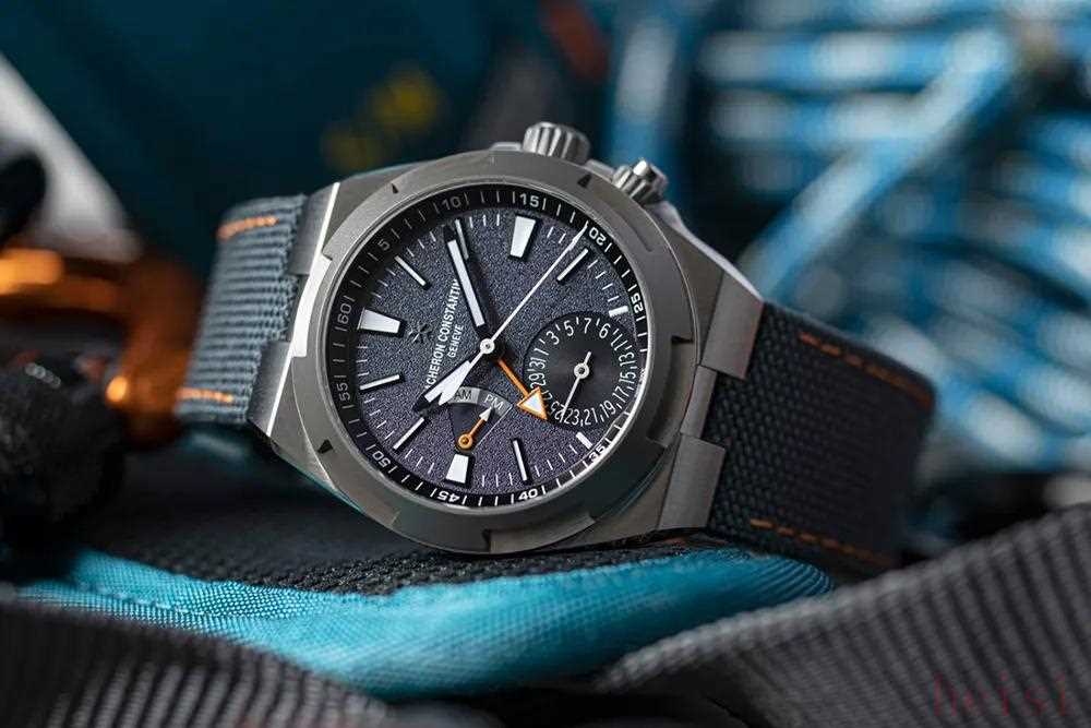 除了那一道“会呼吸的蓝”,江诗丹顿还有另一种蓝,其用于伍陆之型、钢款222、珠峰限量纵横四海等款式上,其中的突出代表就是珠峰限量款,这是纵横四海的隐藏款,2021年推出,发布了计时款5510和两地时款7910,功能与常规纵横四海完全一致,但采用了钛合金表壳,表盘采用了灰蓝色配色,并有颗粒纹理,视觉冲击很强。