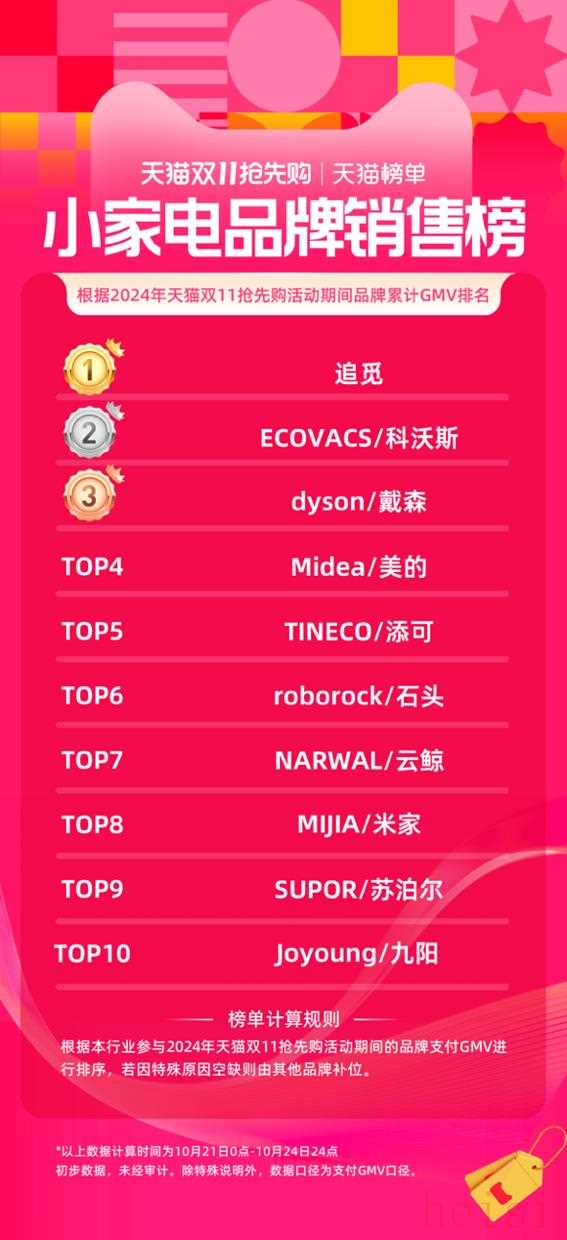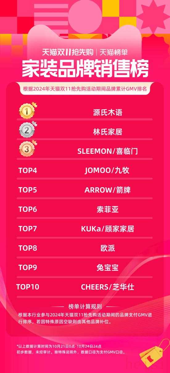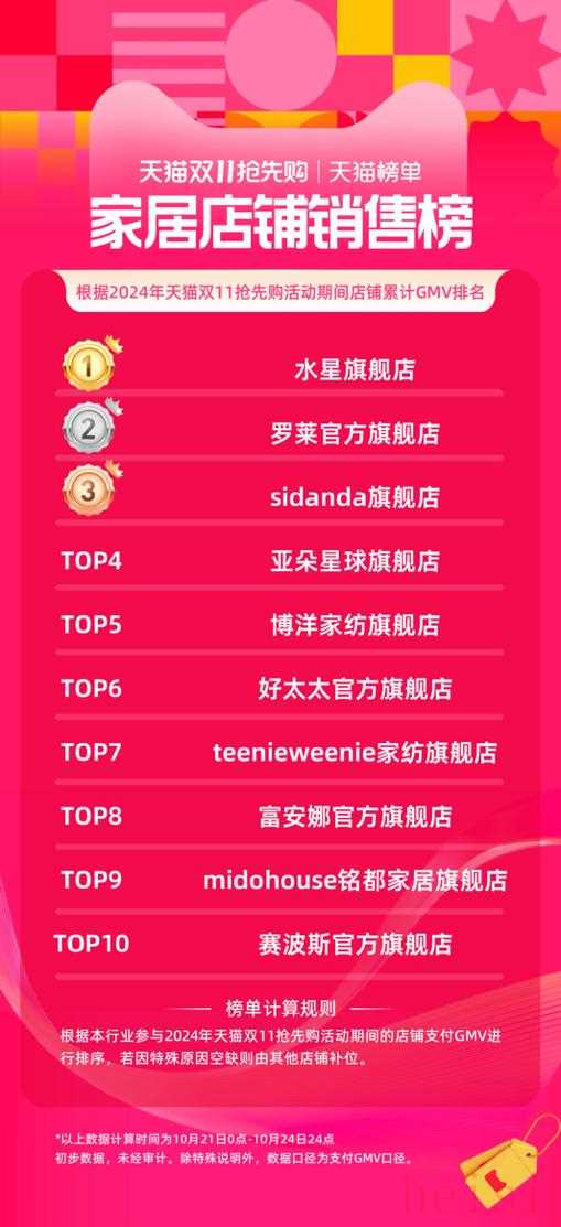 以下为各行业,天猫双11第一阶段(10.21-10.24)品牌成交排行榜: