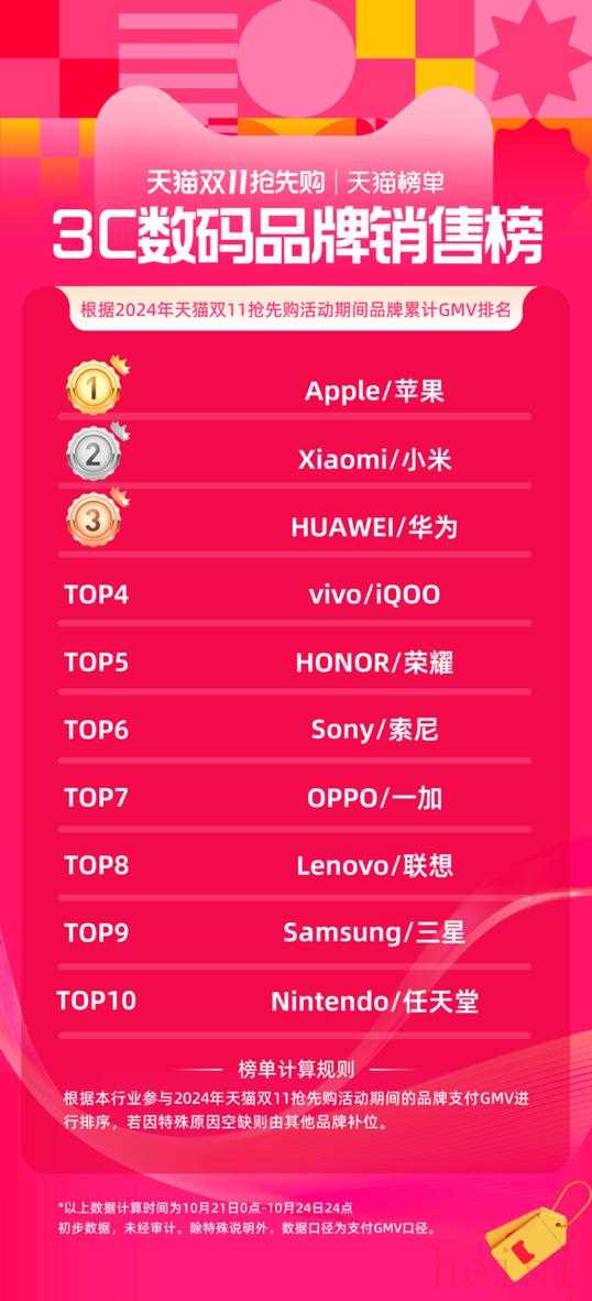 1.  "华为登顶:" 华为再次凭借其强大的品牌号召力和产品竞争力,在2024天猫双11第一波品牌成交榜中"蝉联榜首"。这显示了华为在高端消费电子领域的市场领导地位。