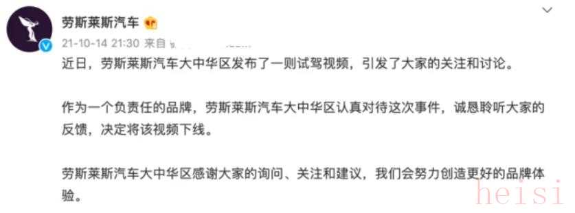 这条发言无异于爆炸前的催化剂,让舆论更加风起云涌,而最终劳斯莱斯也不得不出面道歉,火速下架了相关视频。