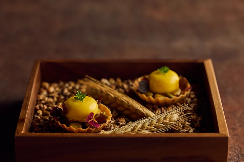 Chef Pili总说一套料理就像交响乐,开场的音符必须轻巧却动人。3道开胃小点分别象徵,将秋收的意象转化为细腻的味觉层次。以炙烤玉米与红藜麦融合南瓜子香气,收敛穀物的焦甜气息;则以姜饼製成小猪造型,包入台湾黑毛猪肉抹酱与丁香香气,带出秋季的温润;以黑麵包粉包裹炸菊芋球,内馅是康堤起司与乌鱼子馅,鹹鲜与奶香交织出丰收后的温暖余韵。