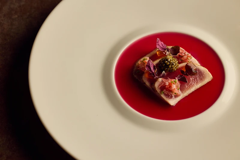 第一道前菜取灵感自秋日薄暮,以稻草轻燻的黄鳍鲔鱼搭配鱼子酱、赤紫苏与洛神花红酒醋酱,酸香鲜明又不失优雅,如霞光洒落天际。紧接的则转为柔光与透明的节奏,以虾蟹澄清汤衬托北海道帝王蟹与埔里筊白笋,加入刺葱绿油,清亮的草本气息让整体更显纯净,像是在秋海边看见光影浮动的瞬间。
