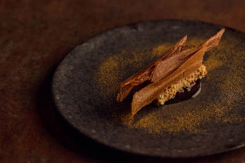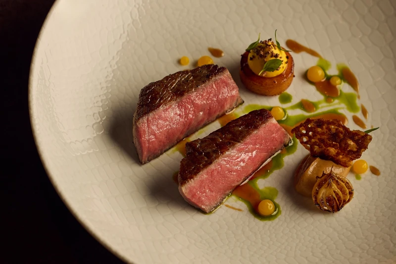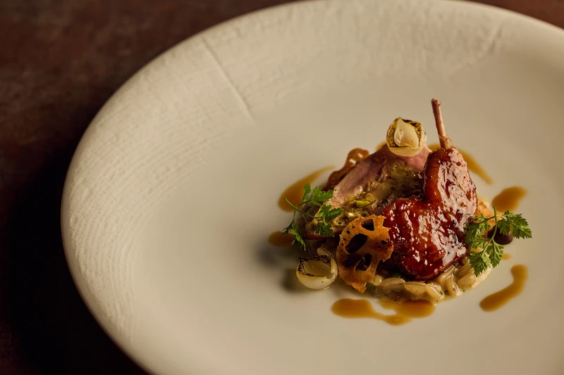 主菜是整套菜单的灵魂,以炭火慢烤的纽西兰鹿里肌,搭配上杜松子、栗子泥与蕈菇精粹,微苦与甘润交织出秋季狩猎的野性气息。若想要更加奢华的口感可加价升级,选用熊本赤牛,以焦化洋葱泥与南瓜慕斯衬托肉香,迷迭香油轻轻划过鼻尖,牛骨酱汁则收敛出温柔余韵,这是属于秋天的力量与沉静。