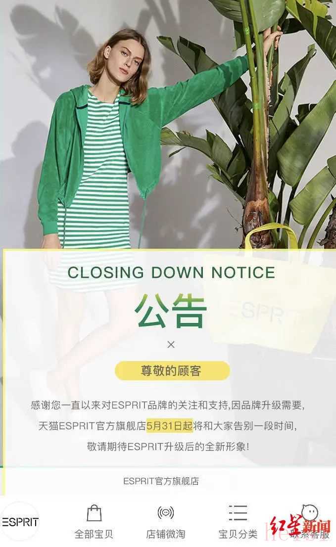 红星资本局注意到,ESPRIT的官方商城已经显示“没有商品”,天猫旗舰店虽然还有宣传图片,但已经无法购买。其公告显示,天猫ESPRIT官方旗舰店5月31日起将和大家告别一段时间,敬请期待升级后的全新形象。这也意味着,ESPRIT未来仍有可能在线上销售。