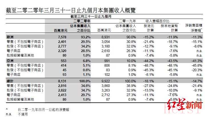 红星资本局查阅思捷环球财报发现,截至2020年3月31日的三个季度内,56间ESPRIT店铺营收仅有2.67亿港元,占同期集团总收入不到4%。而整个2019年财年,思捷环球实现营收129.32亿港元,同比减少16.3%,其中亚洲市场收入只占集团总收入的9.5%;期内净亏损21.44亿港元,同比增长16.1%。