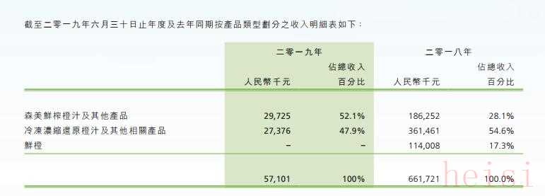 近日,森美鲜榨橙汁的生产及销售商森美控股公布上年度财报,在截至2019年6月30日的12个月内,实现收入5710万元,同比减少89.6%,其中果汁部分收入由去年同期的1.86亿元下滑至2972万元,跌幅83.87%;年度亏损额高达令人咋舌的23.84亿元。