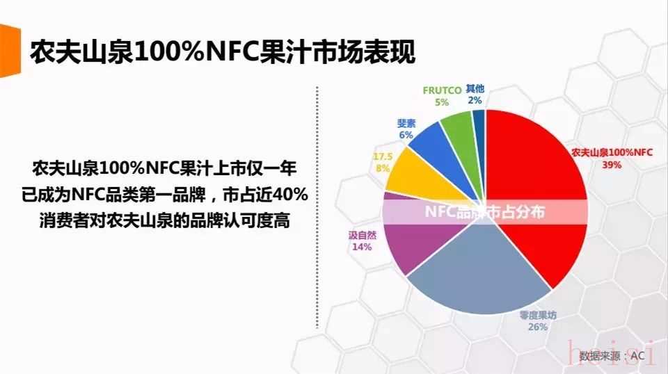 无疑森美正经历着“至暗时刻”,能否柳暗花明,还要看新管理层的能力和造化。但NFC果汁市场仍然不断在涌入新玩家,2016年农夫山泉进军NFC果汁市场,先后推出17.5°NFC果汁和常温NFC果汁,2019年6月再度加码低温NFC果汁系列,意在形成农夫山泉NFC果汁产品差异化,构建完整的产品体系。据悉,此次新品低温NFC果汁就是依托农夫山泉原17.5°NFC果汁的全程冷链运输及储藏体系进行布局。据农夫山泉透露,100%NFC果汁上市一年便成为品类NO.1,市场占有率近40%。