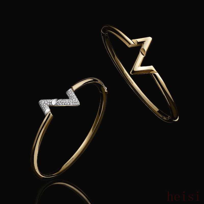 自由旋转的字母L与V,是LV Volt Upside Down系列的标志性设计,衔接构成闪电般起伏的图腾,亦如一瞬间的心电感应,展现简练和醒目的波动。设计最特别的是一枚金质戒指,戒壁一侧以钻石勾勒出V字形图案,从侧面欣赏,则如同2个首字母自然嵌套。