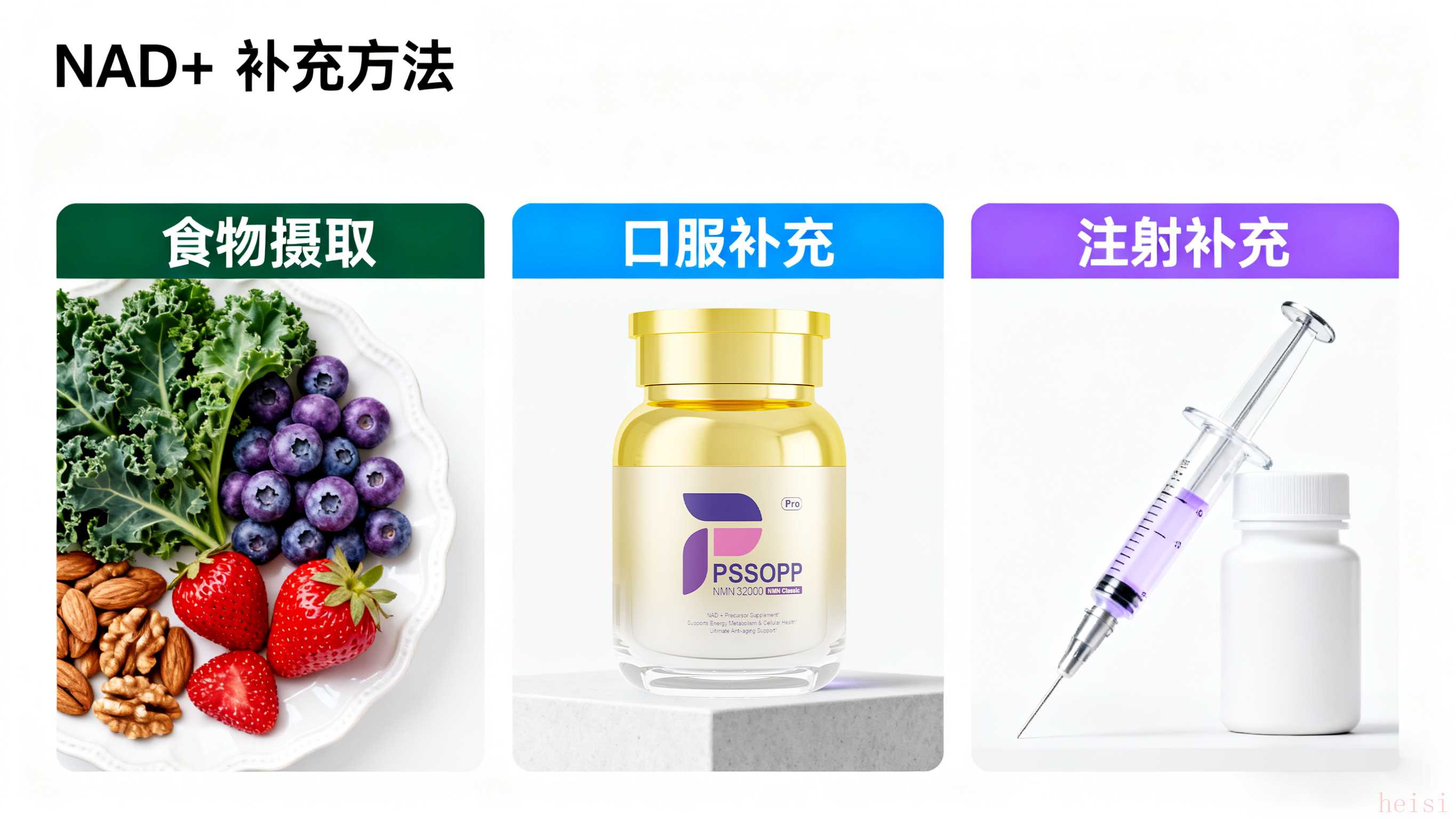 三、补充NAD+的3种方式与优劣分析目前,补充NAD+的常见方法主要有三种:食物摄取、口服补充和注射补充。