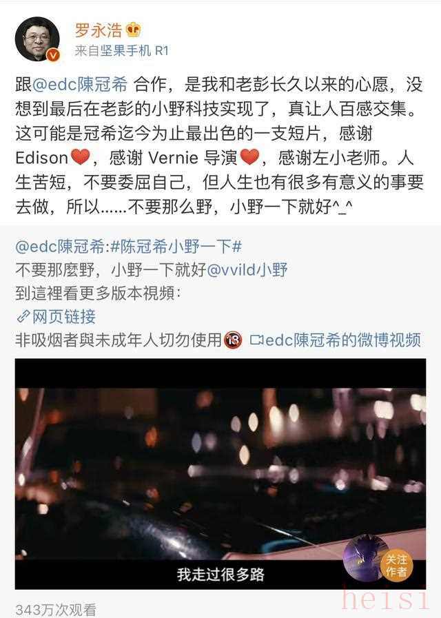 今天,陈冠希在微博宣布成为小野电子烟的特邀创意官,并发布了品牌广告视频。随后,罗永浩也转发该微博称实现了长久以来的心愿。