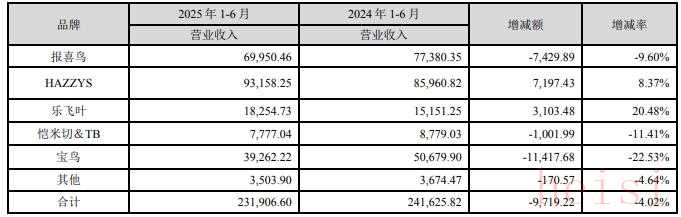 但近一年半,报喜鸟的营收和净利持续承压。2024年,公司营业收入为51.53亿元,同比下降1.91%;归母净利润为4.95亿元,同比下降29.07%;2025年上半年,公司营业收入为23.9亿元,同比下降3.6%;归母净利润为1.97亿元,同比下降42.7%。