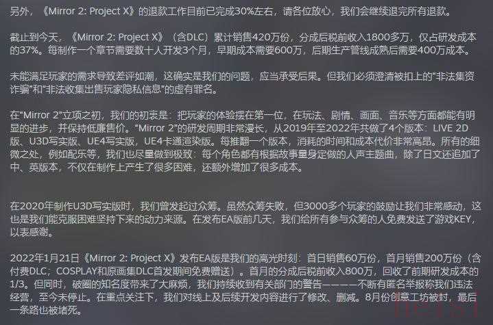 如果你稍微了解点独游开发,就会马上品出这份通告处处都透露着一股不对劲。按照官方说法,《Mirror 2》总计销量420万份,分成后税前收入1800万元,仅占研发成本的37%。也就是说,按照他们的预想,《Mirror 2》至少是一款有着4865万元成本的黄油,哦不对,是R16级别游戏,尊称一声“国产3A”不过分吧?