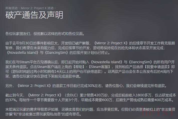 近日,被号称为黄油界“耶路撒冷”的《Mirror 2》官方做出了一个“艰难”的决定,“由于饱受去年的差评风波,开发组已破产解散,《Mirror 2: Project X》后续章节开发将无限期暂停。”