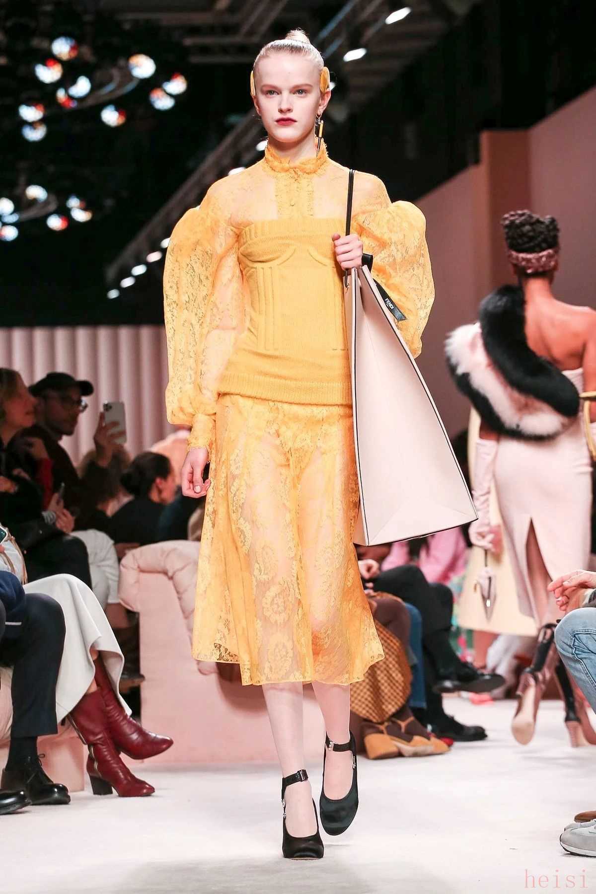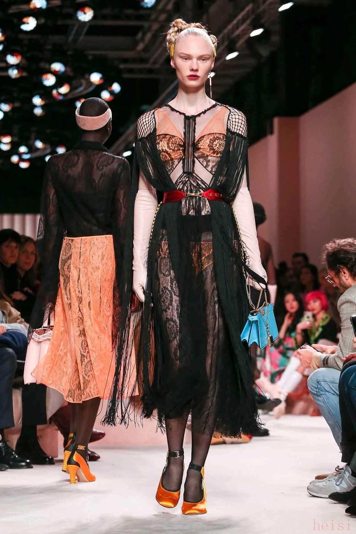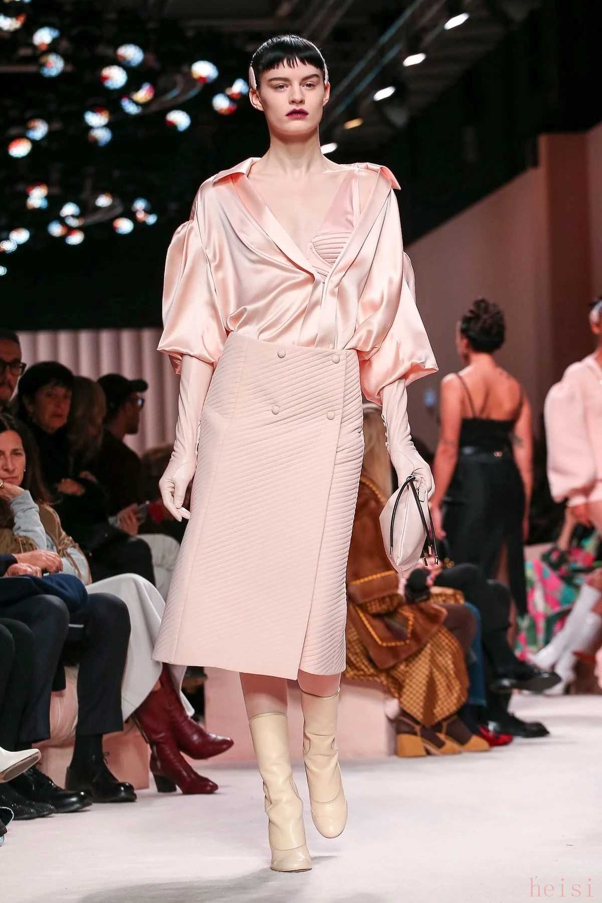 还没来得及抽离,Silvia Venturini又用蕾丝、轻纱和丝绸添了一把干柴,为性感加强火力。蝉翼纱围兜衬衫勾勒出诱人身形,胸衣的轮廓强调着女性特征。这些面料经过Silvia的剪裁,超乎于色彩的表达,即使淡淡的裸粉也按耐不住这股FENDI式致命美人的魅力。