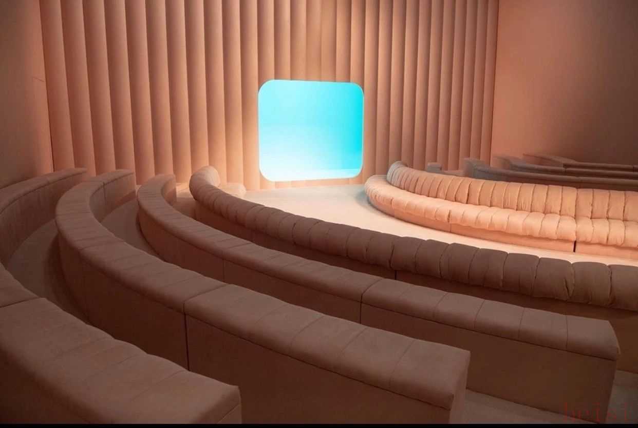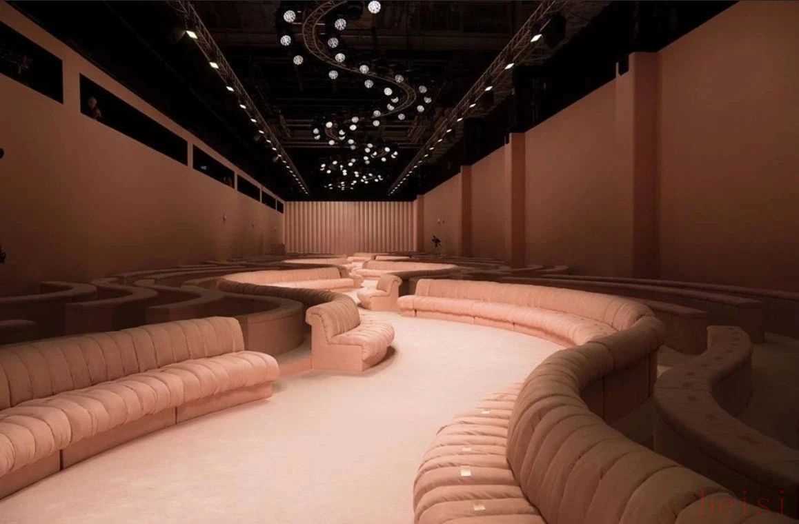 秀场也以裸色作为主色调,同时斜纹如同电影帷幕。而看客们的座位仿佛高级的座驾内饰,很沙龙的感觉,舒服得怀疑自己到底是来看秀,还是来做脸做头发的。