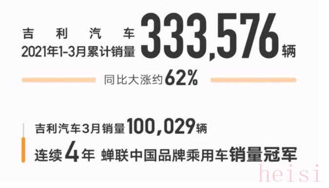 3、吉利汽车第一季度销量:33,3576辆吉利今年一季度累计销量是333576辆,和长城非常接近,不过和长安的36万辆相比,就稍显逊色了。此前吉利已经连续4年蝉联自主品牌乘用车销量冠军,不知道今年会不会被长安拉下马。