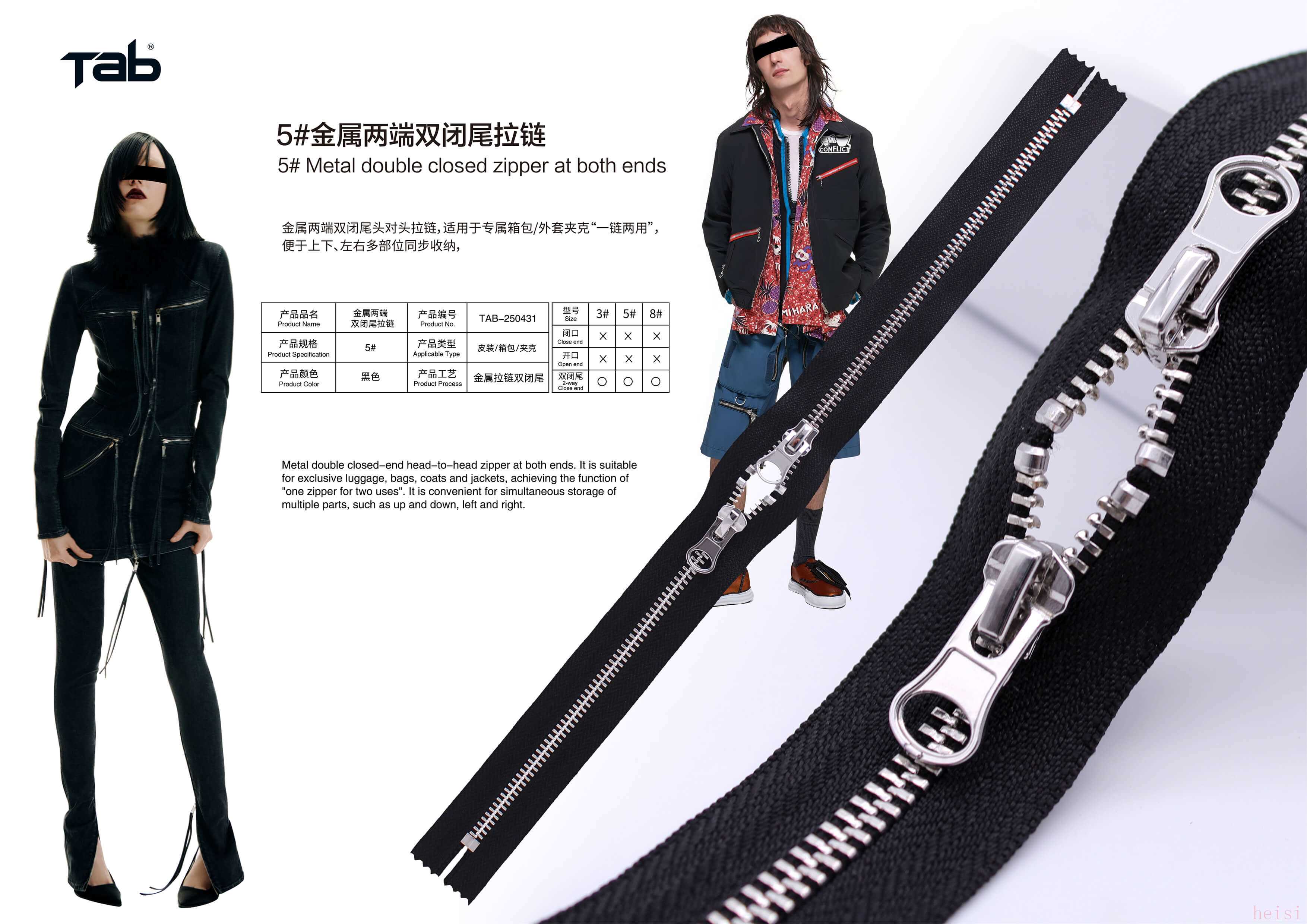 ① 金属拉链专精,铜质拉链采用特殊抗氧化处理,保色期延长3倍