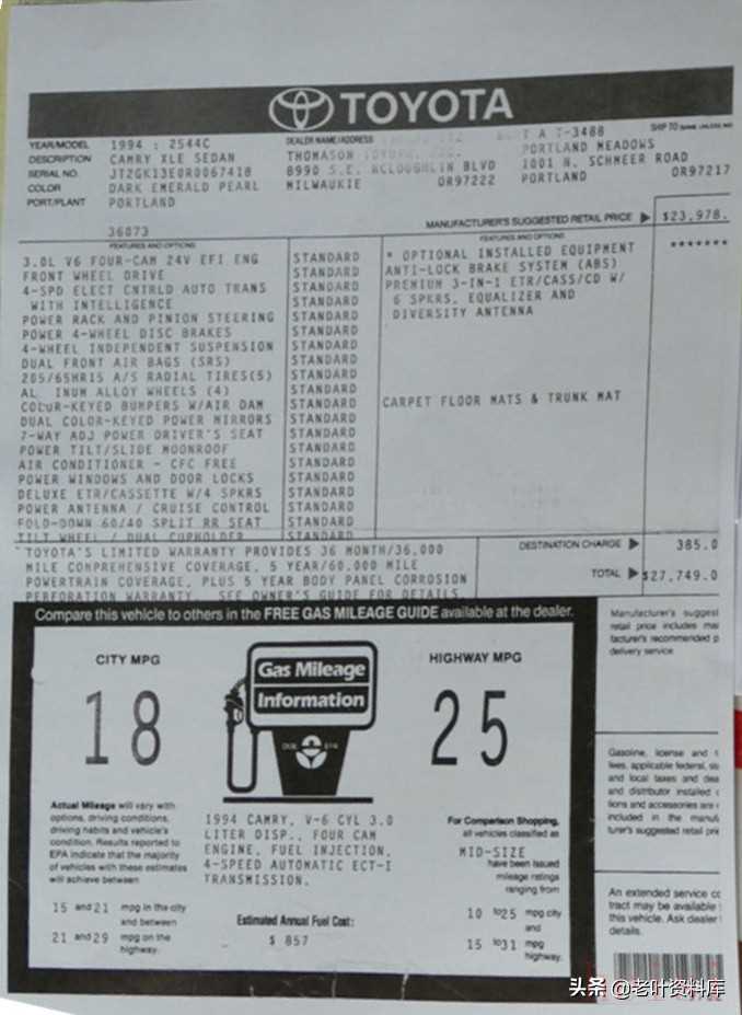 这辆车1994年在美国科罗拉多州的一个丰田销售店被售出,当年的配置价格单还随车保留;标准配置建议售价为23,879美元。这辆车有三个选装配置;地毯、ABS防锁死制动系统以及6喇叭高挡CD音响。加上选装配置和运费后这辆车的最终价格是27,749美元。在1993年1994年的美国,ABS防锁死制动系统是一个高价值配置,只是部分普及,在很多车上还是选装配置。