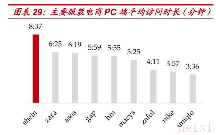在Zara、Nike、H&M、Zara、Asos等一众对手中,Shein的PC和移动端用户访问深度最强,访问时长达8:37分。