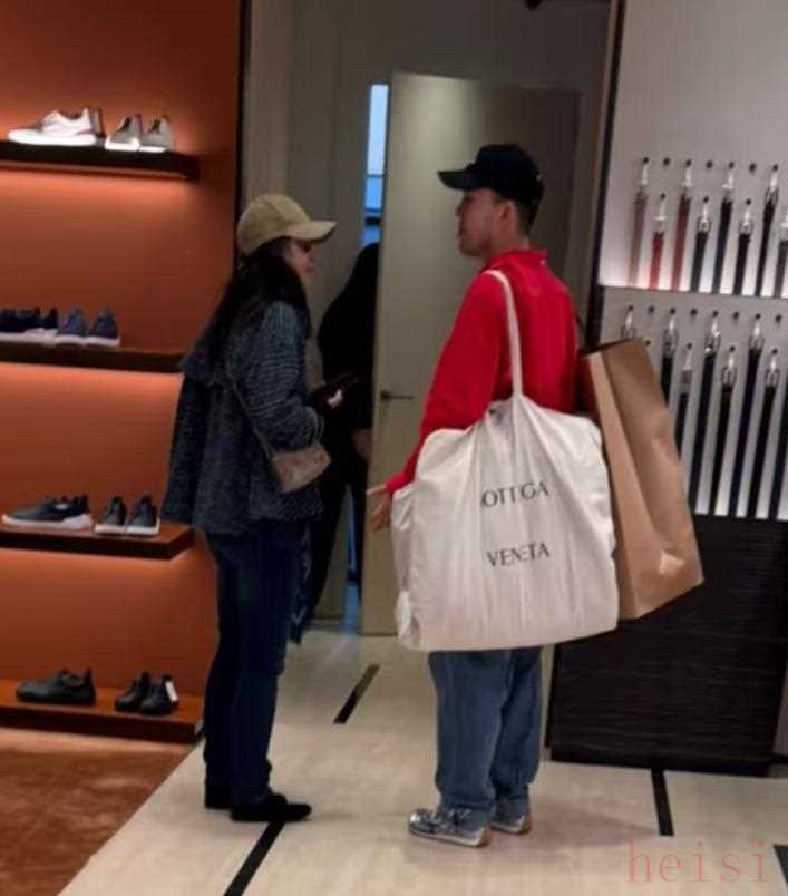 过程也好说清楚。她戴着墨镜和帽子,想低调,但还是被认了出来。柜台前有个认真的核对环节,销售在电脑上敲字,她点点头确认,旁边男士一手两袋、肩上还挂着好几只,动作像专门负责搬运的人。