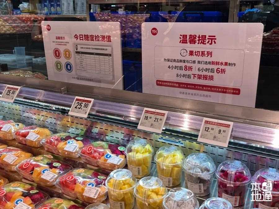 先来看水果区域!升级后的永辉对果蔬新鲜度有更严格的要求,鲜切水果,超4小时八折、6小时六折、8小时下架。你瞧,现场还有口感由轻到重的小贴士!