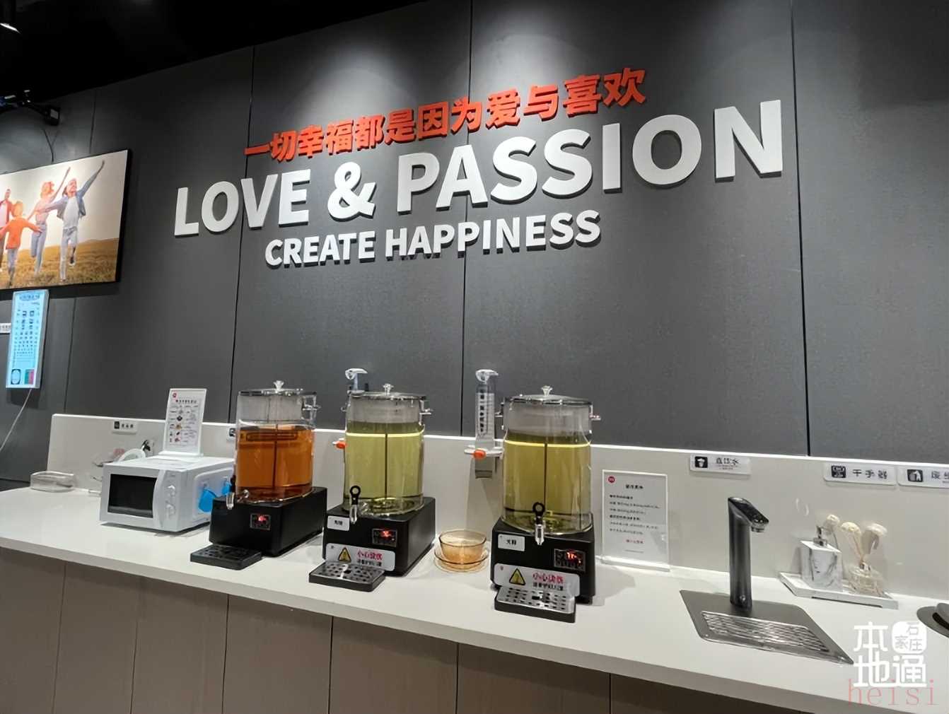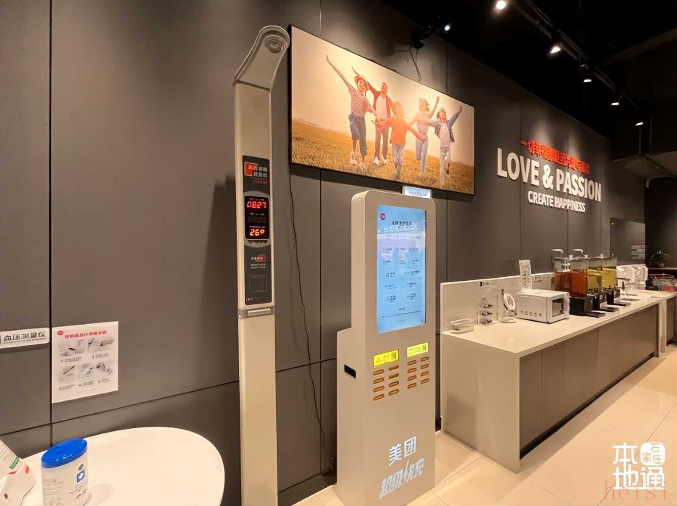从超市出来,还增设了便民服务区,可以在这里歇歇脚,配备血压仪、身高体重测量仪、饮水机、老花镜、洗手池等,还随季供应免费花茶饮品。