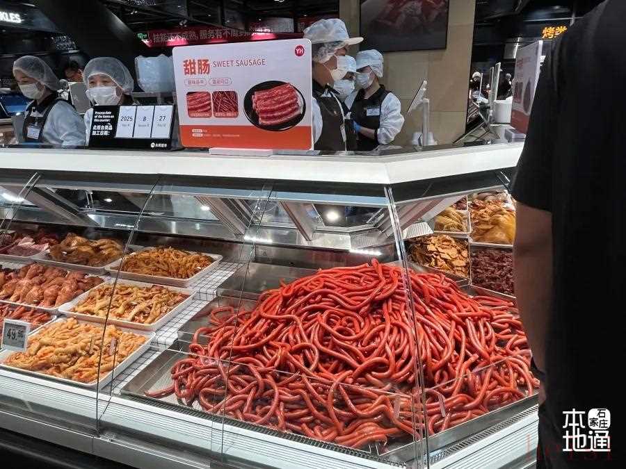 熟食区也很热闹,胖东来同款甜肠、各类卤味肉制品整齐陈列,色泽诱人,光是看着就让人忍不住流口水,不少市民驻足挑选,人气十足。
