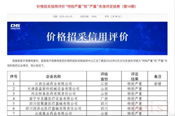9月5日,国家医保局公布了价格招采信用评价“特别严重”和“严重”失信评定结果(第14期),汇总了截至2025年6月30日各省份评级为“特别严重”和“严重”失信的医药企业情况,共有63家上榜。