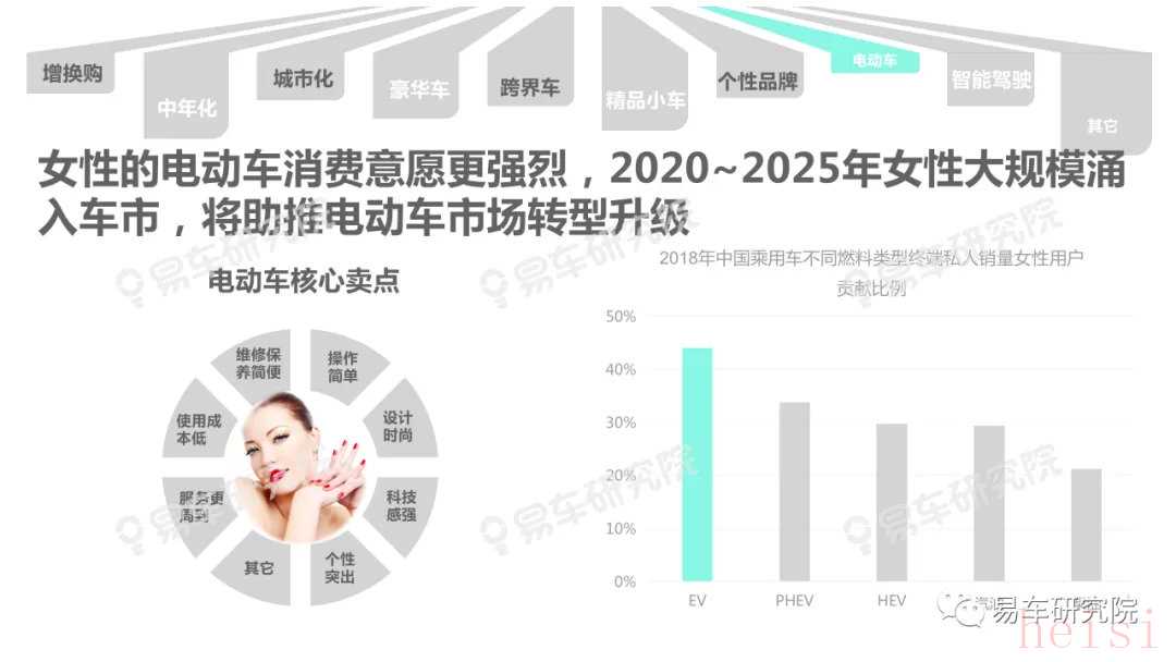 易车研究院《女性用户洞察报告(2020版)》认为,未来几年,女性用户将大量涌入纯电动车市场,持续助推电动车市场转型升级。