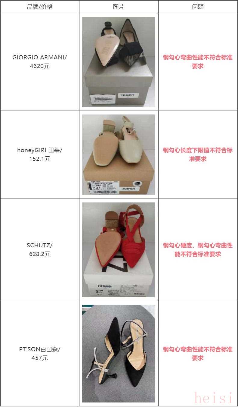 检测结果显示,在参与该项测试的33件样品中,4件勾心太软、太短或测试后时勾心出现明显裂纹甚至断裂。其中,一件售价4620元,标称由乔治阿玛尼(上海)商贸有限公司生产,商标为GIORGIO ARMANI,规格型号为X1E838 3020/237(1.5)的女式高跟鞋存在钢勾心弯曲性能不合格的问题。