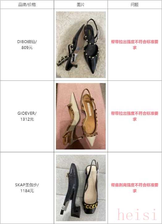 测试结果显示,GIOEVER、SKAP圣伽步、DIBO碲铂的3件样品帮带拉出强度或帮底剥离强度不符合其明示标准要求。
