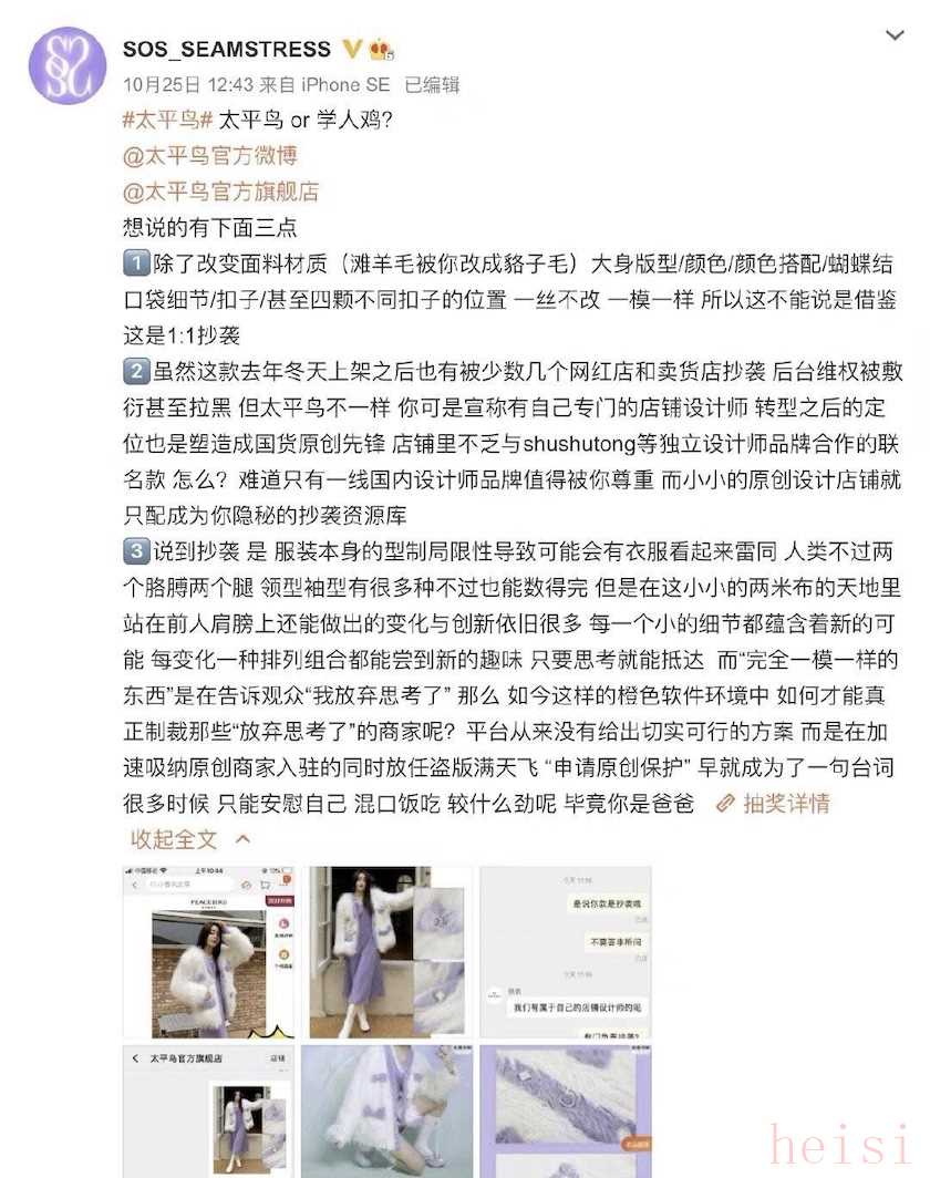 自微博时尚博主SOS-SEAMSTRESS以一篇名为《太平鸟or学人鸡》的文章控诉太平鸟1:1抄袭其同名品牌服装,且以原版七倍的价格售卖后,#太平鸟多次被控抄袭#也登上微博热搜,至今已有超2.4亿阅读量。