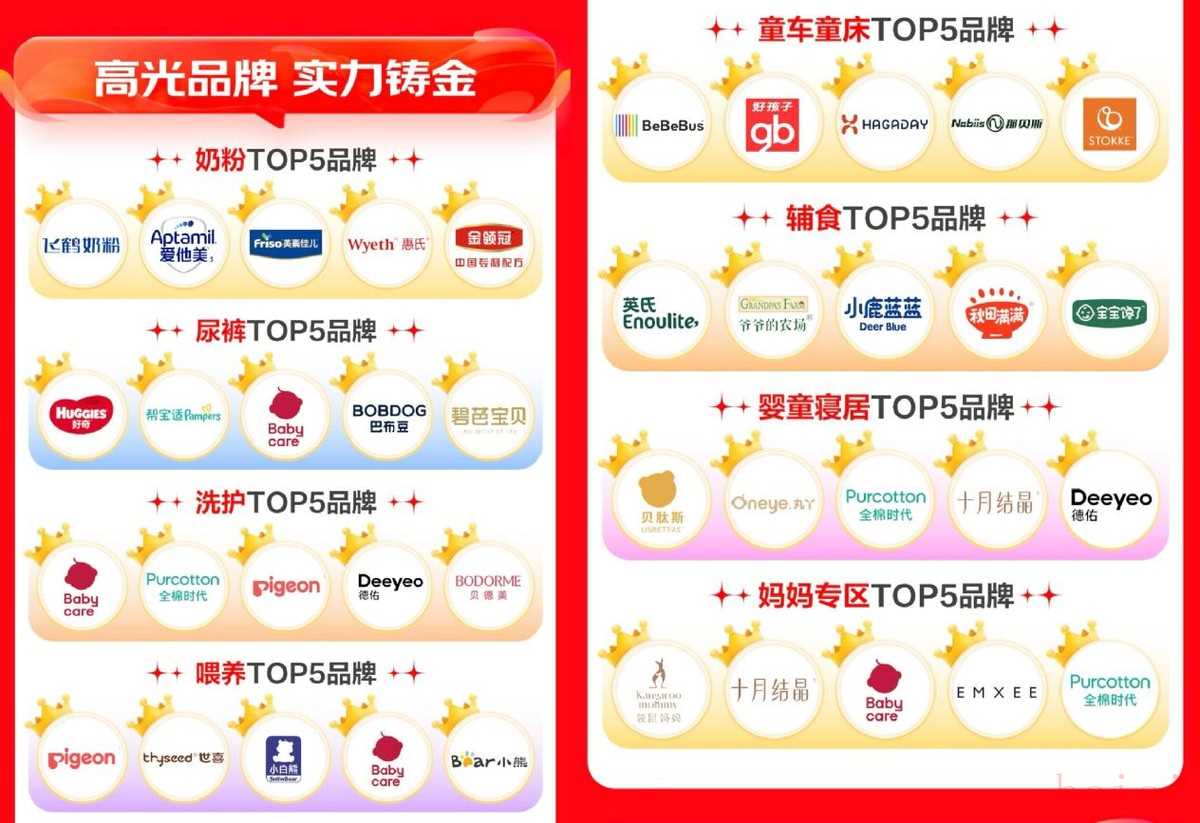 根据全周期各母婴品牌成交额显示,飞鹤奶粉、好奇、Babycare、Pigeon、Bebebus、英式、贝肽斯、袋鼠妈妈等40个品牌登上细分品类TOP5榜单,覆盖奶粉、尿裤、洗护、喂养、童车童床、辅食、婴童寝居、妈妈专区8大品类。