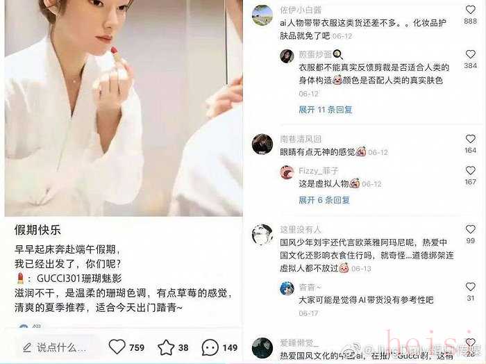 界面时尚此前曾报道,翎LING曾在一次美妆带货上“翻车”,其在小红书上发布的一则口红种草笔记受到网友质疑。不少网友认为,虚拟人物为服饰带货尚可,为化妆品带货则会产生违和感。