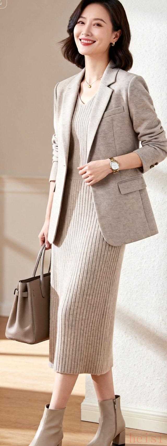 莫兰迪灰调更保险,COS有条燕麦色针织裙,搭结构感马甲直接开会。