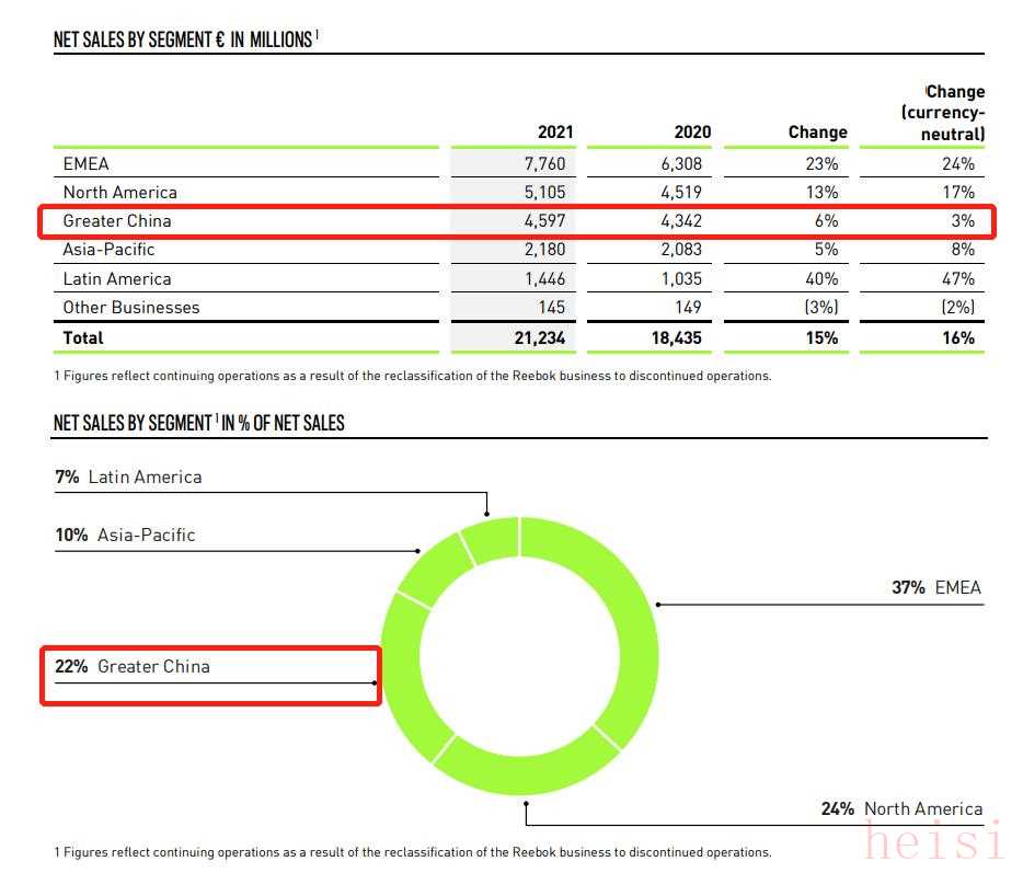 翻阅近年财报,大中华区的销售占比达到阿迪达斯总收入的20%左右。在2019年,亚太地区整体增速为10%的时候,大中华区增速15%;疫情严重的2020年,大中华区也率先复苏;2021年3月,阿迪达斯还将大中华区列为公司三大战略重点市场之一,并称未来几年内,大中华区市场将成为全球范围内增速最快的运动品市场,公司准备加大对大中华区的投入。