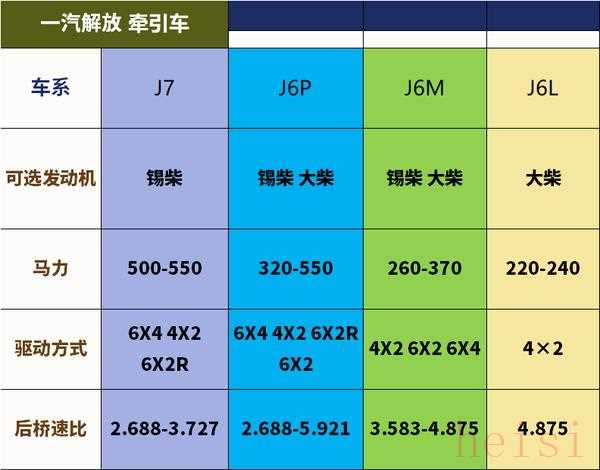 J6P可选发动机有锡柴、大柴,最大马力320-560,变速器9-16挡可选,后桥速比2.688-5.921。