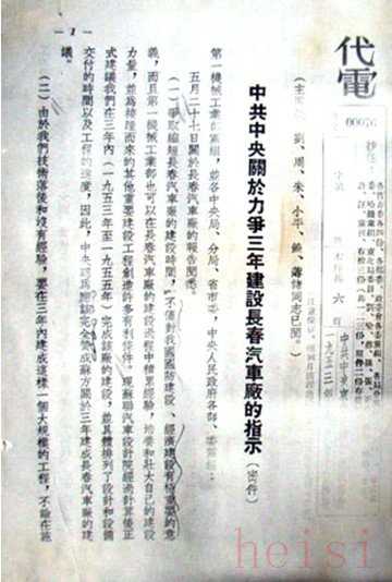 指示指出:"由于我们技术落后和没有经验,要在三年内建成这样一个大规模的工程,不论在施工力量上的组织、施工的技术、国内设备的供应以及生产准备等方面,都将会有很大的困难。因此,中央认为有必要通报全国,责成各有关部门对长春汽车厂的建设予以最大的支持,力争三年建成。"