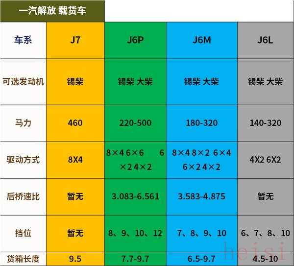 J7载货车目前仅一个车型,具体为锡柴11L发动机,最大460马力,驱动形式为8×4,货箱尺寸9.5米。