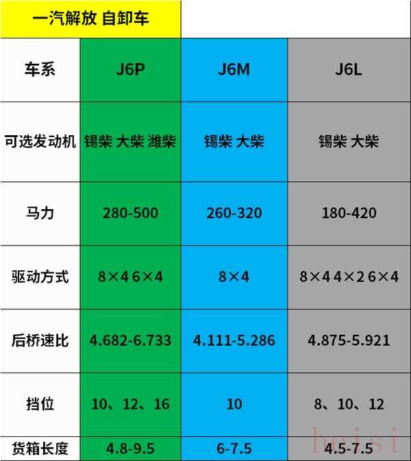 J6P驱动形式有8×4、6×4,发动机可选大柴、潍柴(气体机)、锡柴,最大马力280-550,可选10-16挡变速器,后桥速比4.682-6.733。货箱长度4.8-9.5米。