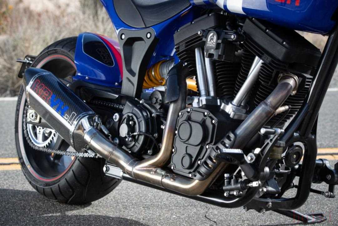 这款V型双缸发动机排量高达2032mL,再加上推杆气门发动机的低转速大扭矩特性,让KRGT-1成为真正的街头暴力猛兽。据测试,KRGT-1从怠速起就能输出充裕的力量,最大扭矩达到164N·m,扣除传动损失后,后轮仍然能获得156N·m的强大扭矩。同时,ARCH工程师在发动机的前部安装了隔离阻尼器,有效减轻了振动,提高了长途巡游的舒适度。另外,与美式摩托车惯常采用的侧吸式进气系统不一样,KRGT-1采用了下吸式进气系统,实现了简洁美观的造型,更符合现代审美理念。